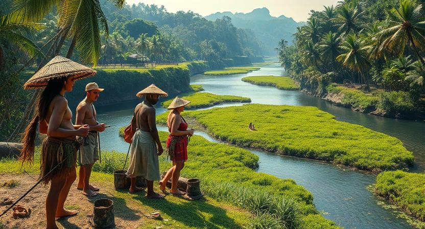 • Indigenous groups living along fertile riverbanks engaged in agriculture and developed complex societies